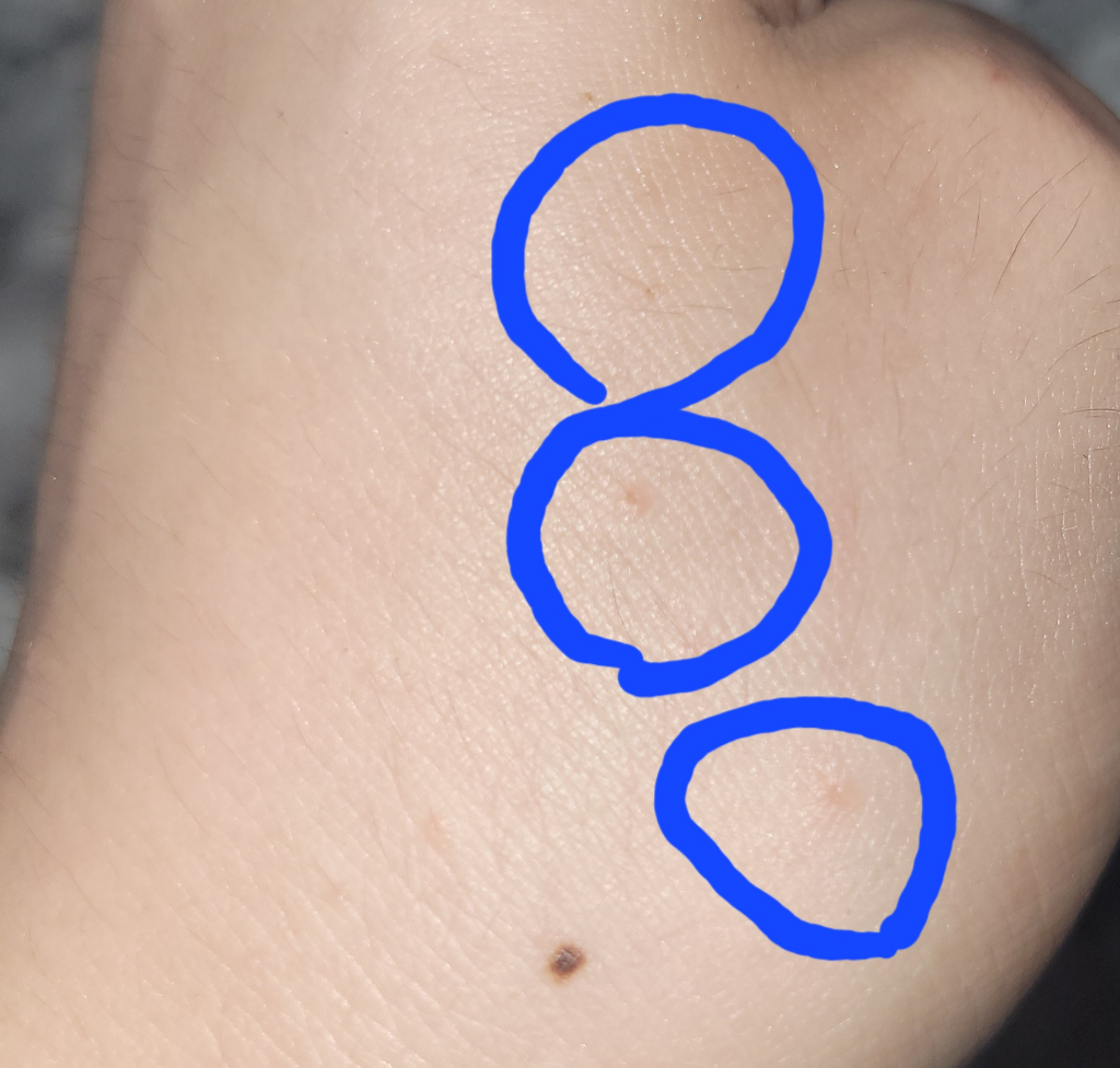 주로 동그란 붉은 점, 부종 등을 동반한 습진 형태의 병변을 보입니다. 심한 경우 수포나 진물을 동반하기도 하며 일부에서는 여드름성 병변, 두드러기성 병변, 다형 홍반, 색소침착, 육아종성 병변 등도 발생할 수 있습니다.