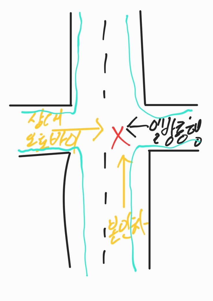 신호가 없는 교차로에서 서로 직진 중 오토바이와 충돌사고가 발생했습니다. 사고 상황은 그림으로 표햔했습니다. 저도 직진중이였습니다. 충돌한 오토바이도 제 기준 좌측 도로에서 직진하고 있었습니다. 상대 오토바이는 일방통행 도로에서 반대로 역주행으로 오는 사고 였습니다. 이 사고로 오토바이 운전자 분은 다리 골절이라고 들었습니다. 이 사고가 오로지 저의 과실로 발생한건지, 피해자, 가해자가 누구로 구분되는지 궁금합니다.