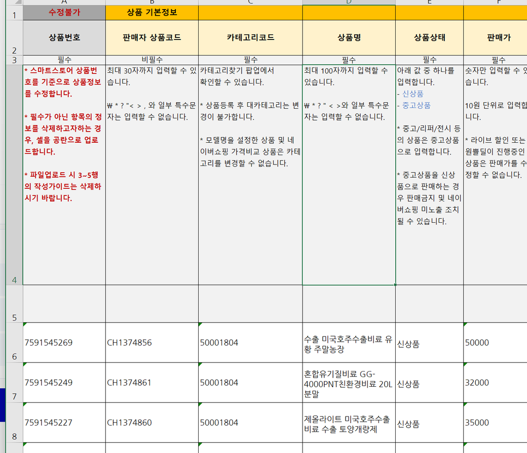 모든 "판매자 상품코드" 내용에다가 "가격준수" 라는 단어를 붙이고싶어요