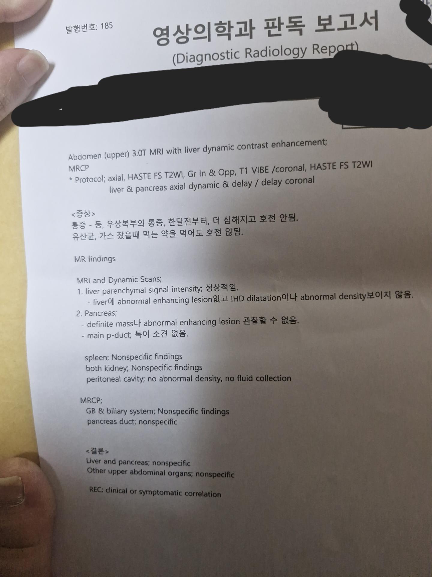 이번 검사는 췌장 MRI + MRCP를 포함한 정밀 상복부 MRI이며, 판독상 간과 췌장 모두 영상학적 이상 소견은 없습니다. “보이지 않음”, “관찰되지 않음”은 정상 판독 표현입니다. 현재 결과만 놓고 보면 췌장 MRI를 추가로 받을 의학적 근거는 크지 않습니다. 증상이 지속되면 영상보다는 임상 증상과 혈액검사(췌장효소 등) 중심으로 추적하는 것이 합리적입니다.