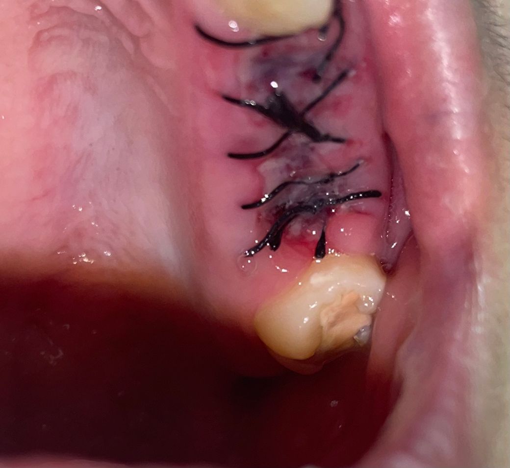 꿰맨 부위 왼쪽 아래 희게 보이는 것을 질문한 것으로 보입니다. 발치한 부위가 상대적으로 붉게 보이니 약간 희게 보일 수도 있습니다.