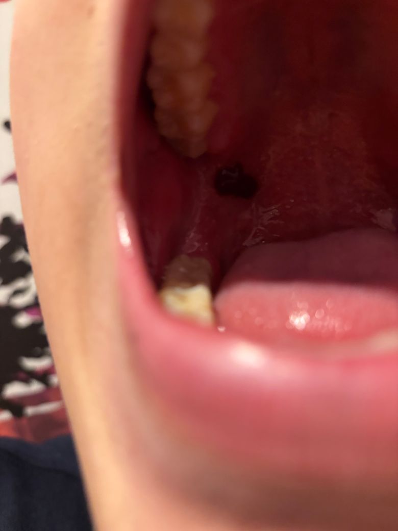 아니 분명 돈가스를 먹기 전까지는 이물감이 전혀 없었는데 뜨거운 돈가스를 먹다가 입천장이 까졌나 했는데 이물감이 너무 커 사진을 찍어보니 피가 고인 것 처럼 이런게 있네요… 혹시 이게 무엇인지, 병원을 가야하는 것인지 알려주실 분 있나요…….