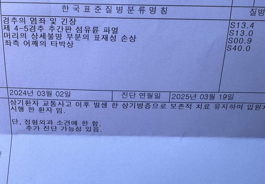 현재 다른 것은 모두 12급 이하의 상해이나 S13.0 코드는 외상성 경추 추간판 파열이기에 상해 급수 9급이며 해당