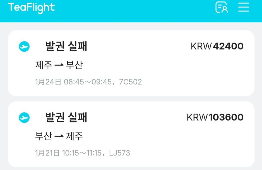 Teaflight에서 제주행 왕복 비행기를 15시 9분에 결제했고, 당일 15시 10분에 발권 실패 메일이 왔습니다.