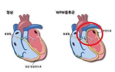 아래 그림에서 보시면 왼쪽에는 정상적인 회로만 존재하는데 오른쪽에는 '부전도로'라고 하는 회로가 존재함으로써 부정맥이 생기는걸 볼 수 있습니다.