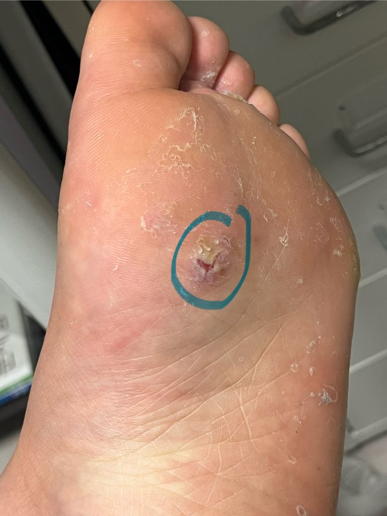 한 학생인데요 왼발에 무좀이 있어요 근데 물집은 아니고 비슷한게 있었는데 걸을때 걸리적거리고 아파서 어제 아버지가 소독하고 바늘로 찔러줬는데 찔럿을때 피가 나와서 바로 소독했는데 하루가 지난 지금은 아파요(아래 사진 확인하고 질문들 답해주세요 동그라미 부분이 아픈 부분이에요)
