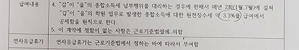 저는 입시 미술학원 강사이며 5인이하 사업장에서 프리랜서(3.3퍼공제)로 일합니다. 현재는 일을 그만 둔 상태이고 제 스튜디오를 차리려고 하는데 지난 계약서상 문제되는것들이 있는거같아서요. 계약서는 이미지 확인 부탁드립니다.