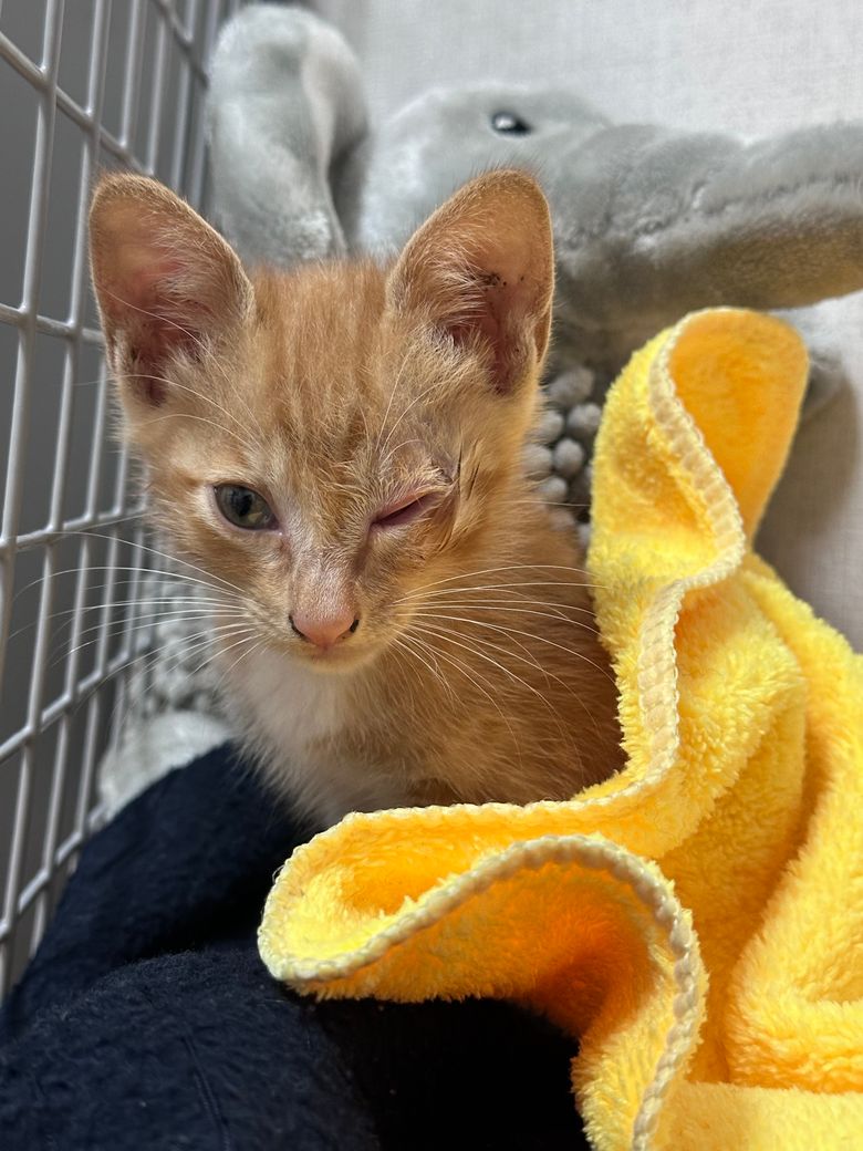 친구가 비 엄청 오는 날 눈이 다친 채로 어미없이 야옹거리길래 구조했고 자취하는 제 집에서 임보한지 이틀되는 2-3개월된 아가입니다!