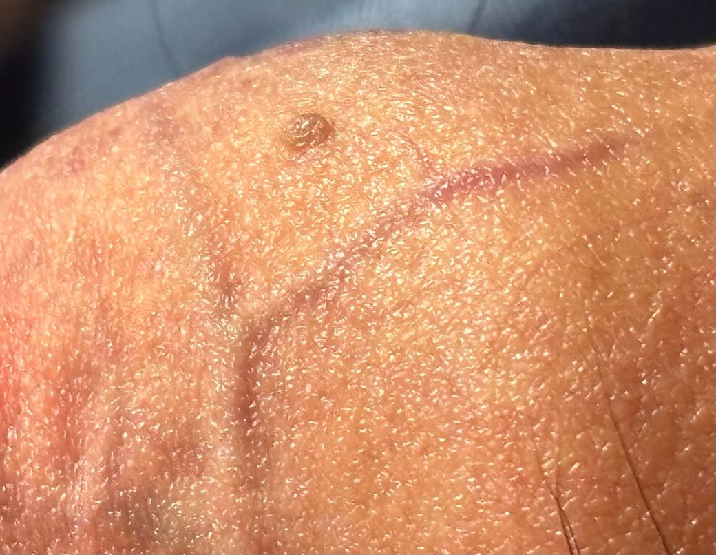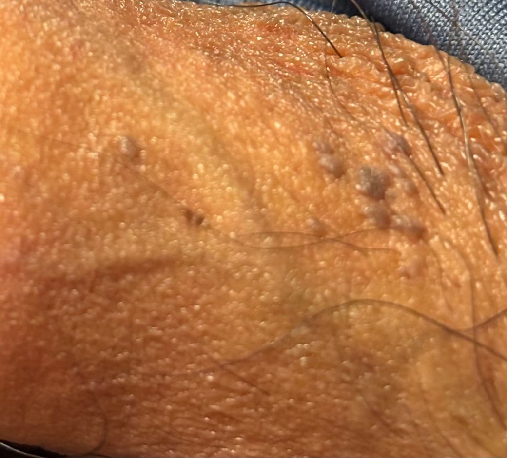 사진에서는 음경 피부에 1에서 3 mm 정도 크기의 회색 또는 갈색 구진들이 모낭 주변에 모여 있는 형태로 보입니다. 표면이 거칠거나 꽃양배추 모양으로 돌출된 형태는 뚜렷하지 않습니다. 현재 모습만으로는 전형적인 곤지름 소견과는 다소 거리가 있습니다.