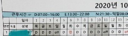 아래 제가 일했던 근무표 첨부했습니다. Day 근무시간도 근무표 위에 명시되어있습니다