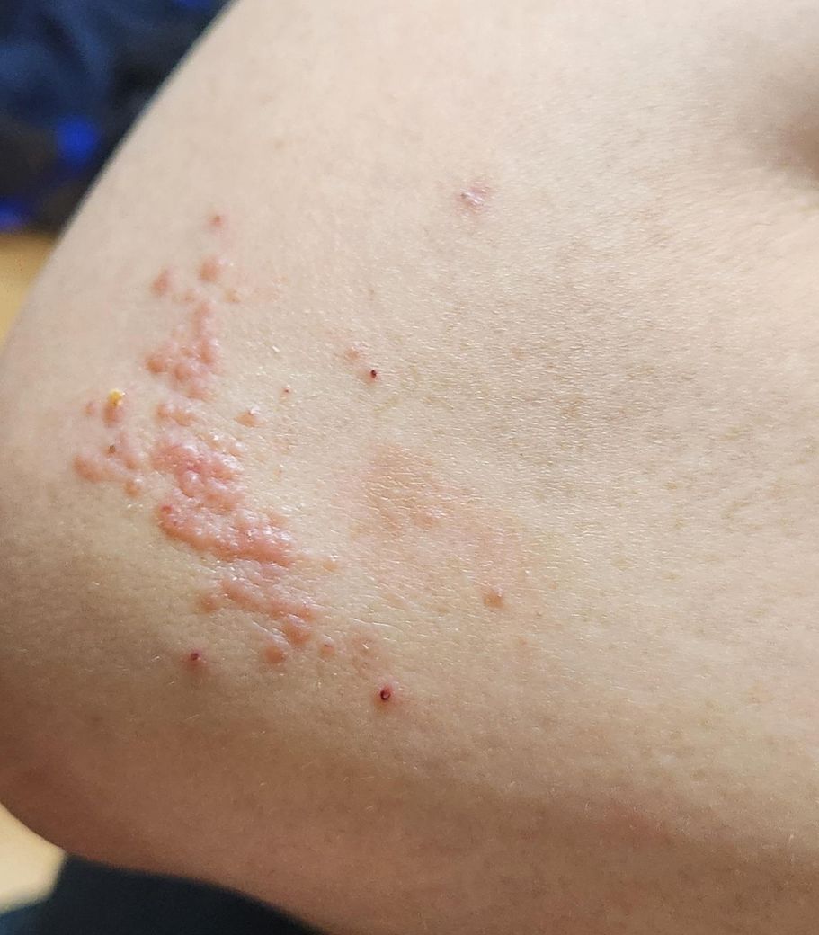 팔꿈치에 발생한 단순 혹은 대상 포진으로 보이며 헤르페스 바이러스에