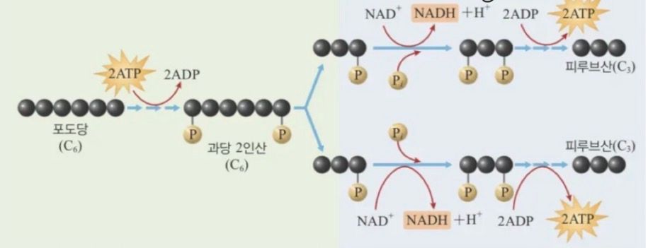 포도당이 분해되어 피루브산과 ATP를 만드는 초기 대사 과정이에요. 이 과정에서 NAD⁺가 NADH + H⁺로 환원되면서 수소 이온이 생성되죠. 또한 전자는 NADH 형태로 저장되는 특징이 있어요.