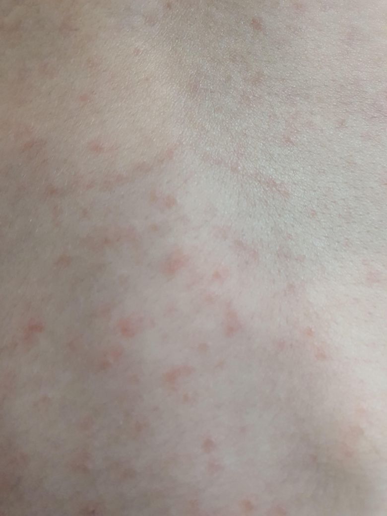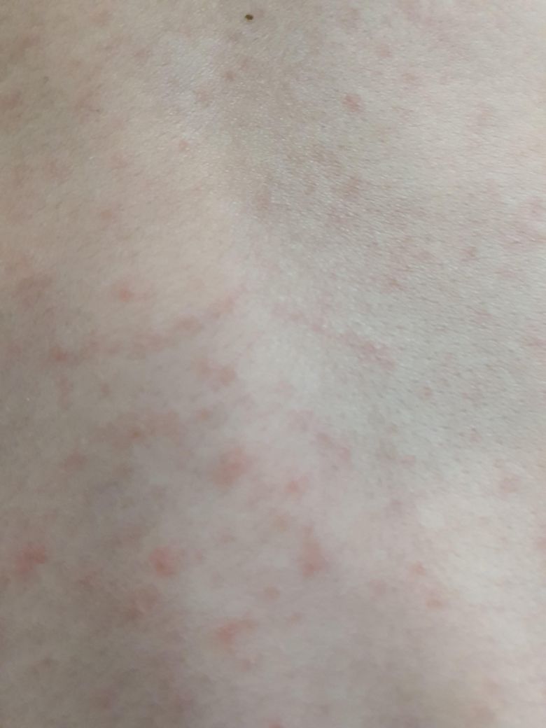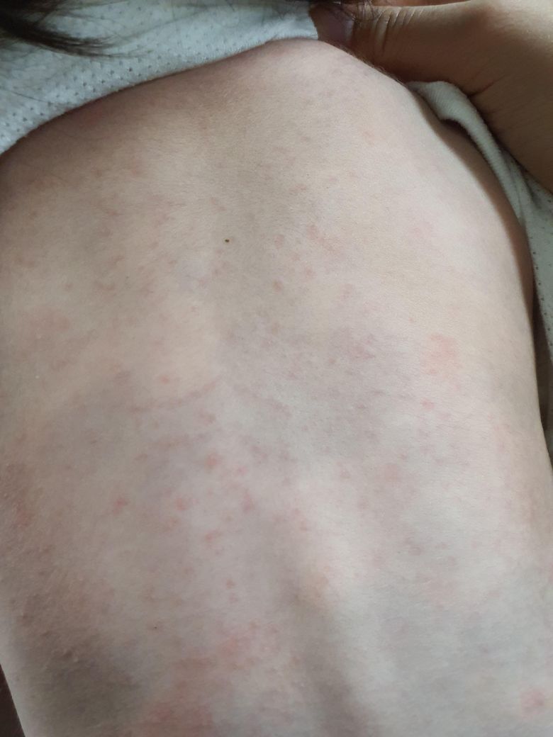 하원 후 얼굴, 등 보니까 사진처럼 발진이 올라왔더라구요. 날씨가 추워져서 맨투맨 상하의를 입혀 보냈는데 땀띠가 난 걸까요? 확인부탁드려요~