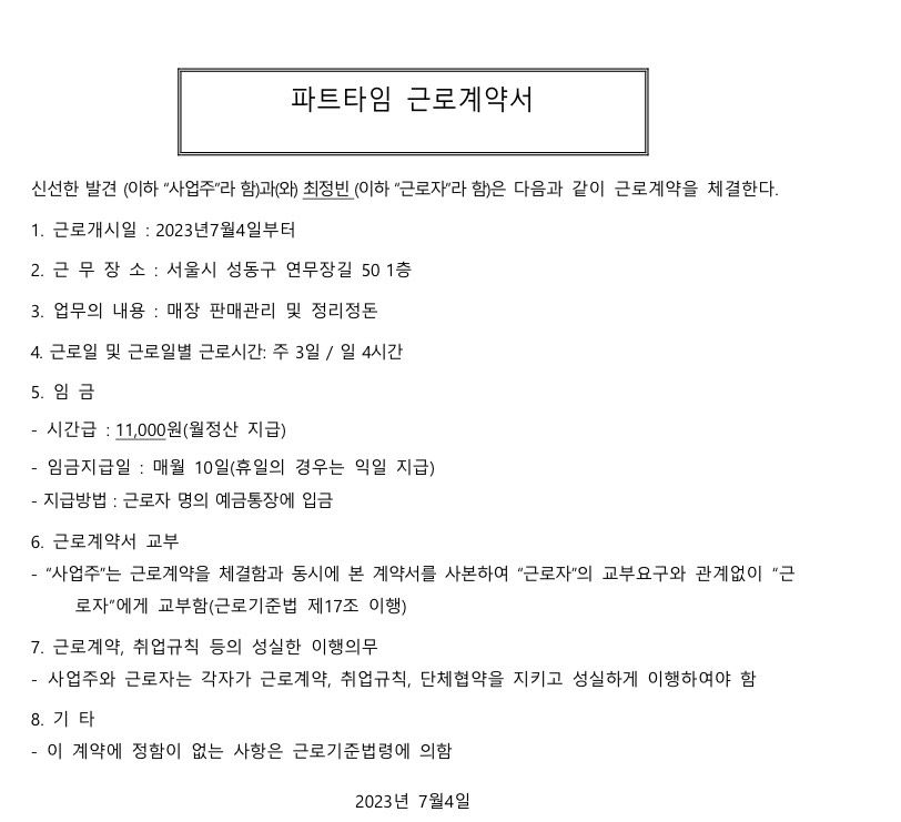 20233.07.04-2024.05.25까지 근무하였고 주 16시간이 된 주도 있고 안된주도있지만 거의 주 16시간을 넘겼습니다.