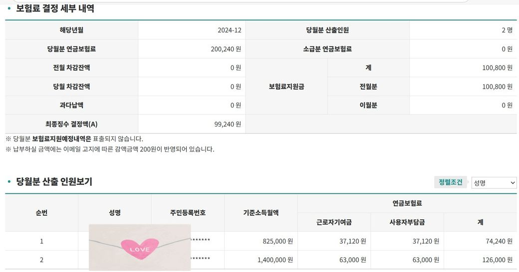 이번달에 직원1명이랑 저랑 합쳐서 두루누리 지원금도 받아서 국민연금 총 99,240원을 냈어요
