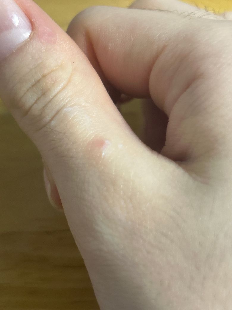 사진을 확인한 결과, 손에 나타난 병변은 작은 붉은 구진 형태로 보이며 가려움이 동반된 상태입니다. 이러한 증상은 접촉성 피부염, 한포진(습진의 일종), 또는 경미한 피부 감염(모낭염 등)과 같은 원인일 가능성이 있습니다.
