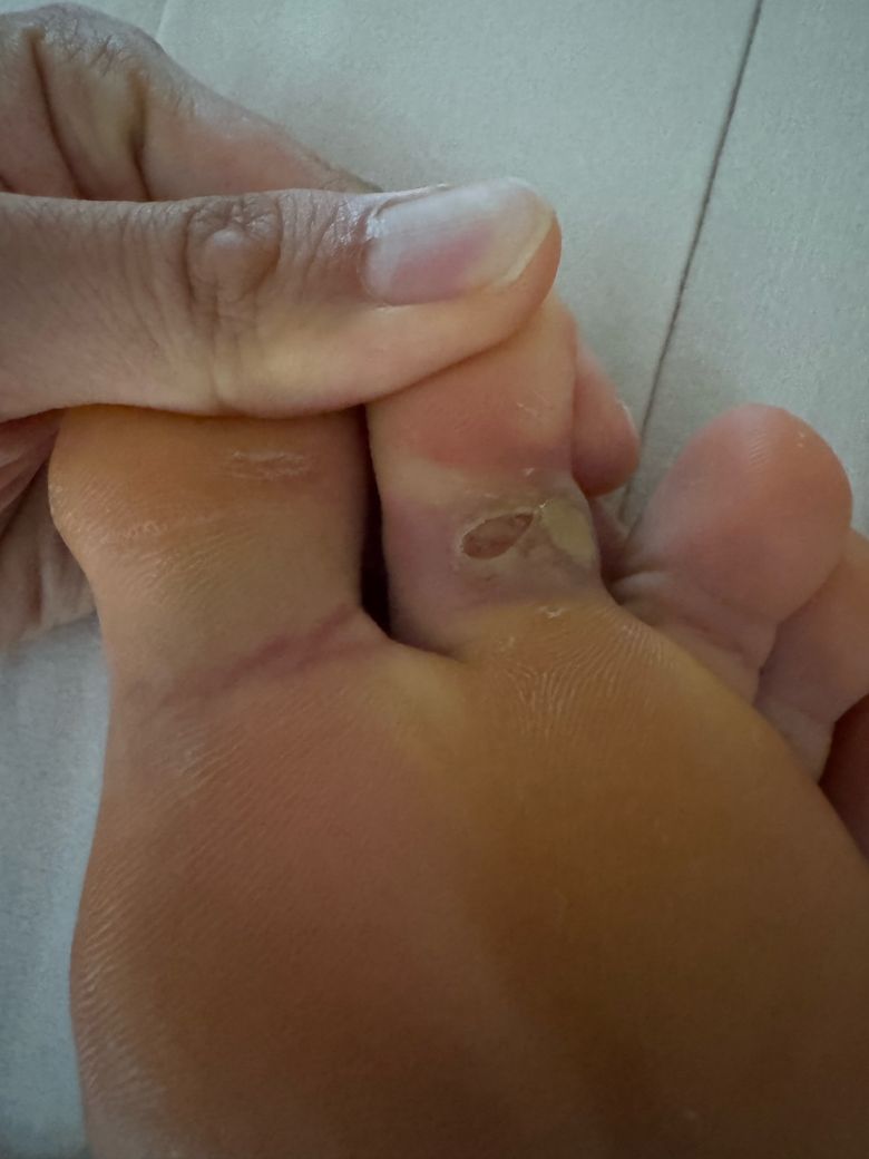 물집이 있었던 자리가 현재 상태가 사진과 같아서 해당 부위로 걸을 때마다 따갑습니다. 굳은 살이 베긴거 같습니다