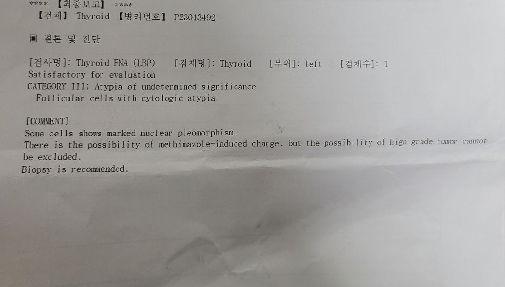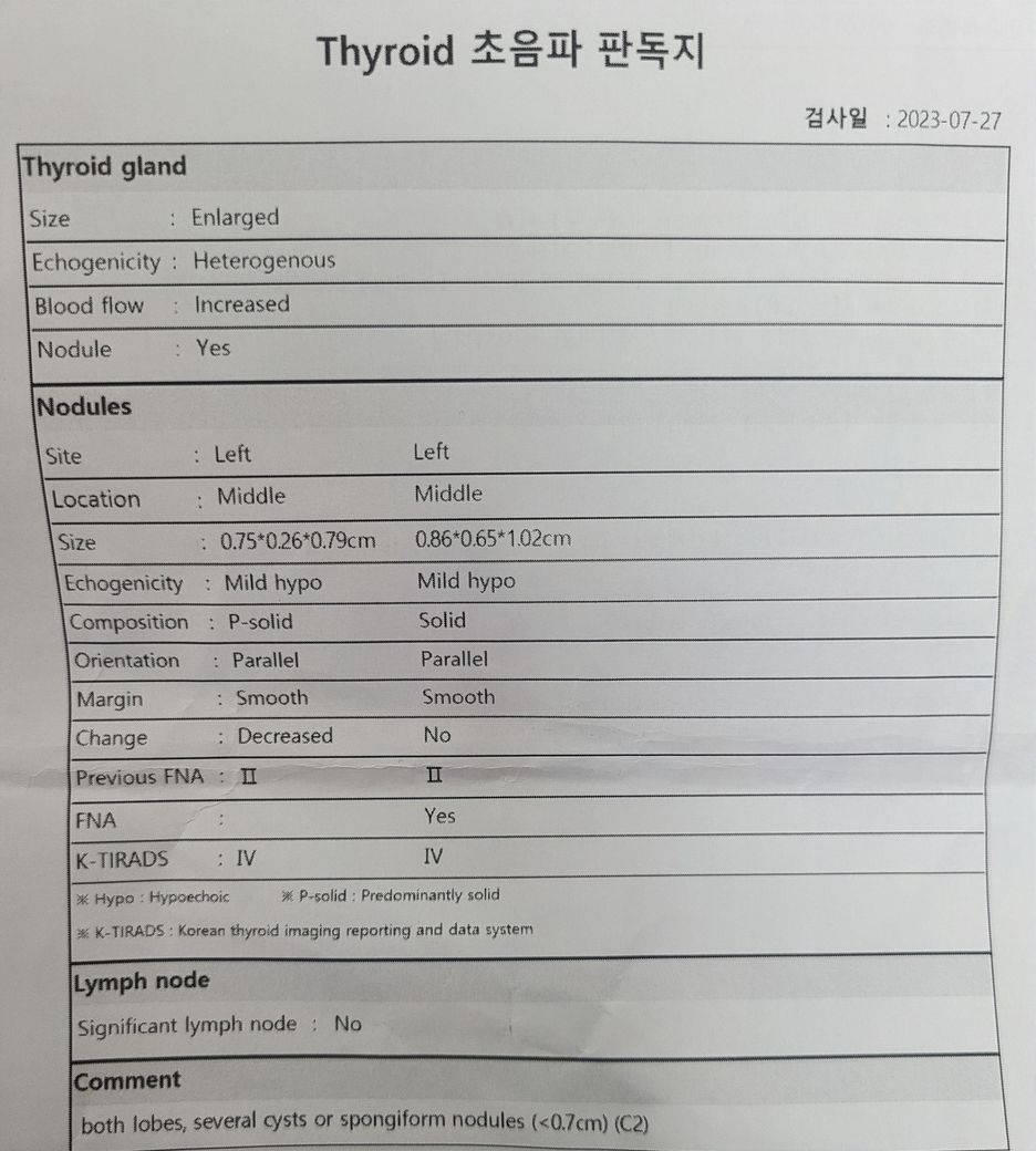 갑상선 세침검사 및 초음파 결과 해석/판독 부탁드립니다