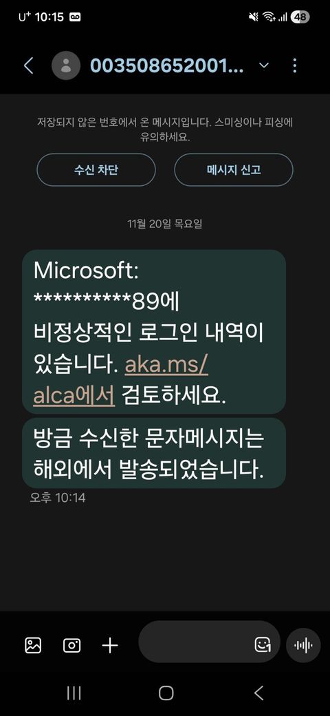 확인할 때는 문자에 있는 링크를 절대 누르지 말고 본인이 직접 브라우저에서 마이크로소프트 공식 홈페이지에 접속해서 로그인 기록을 확인하는 것이 안전합니다.