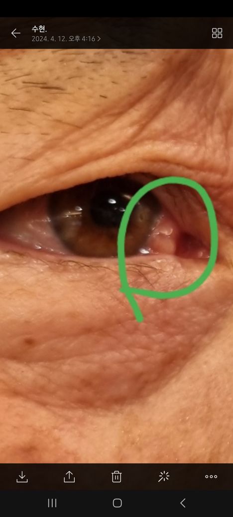 저희 할머니께서 오른쪽 흰 눈동자에 뭔가 볼록 튀어 나왔는데아프진 않다고 합니다. 다럐끼인가요? 스트레스를 받으셔셔 엽증이 눈에 올라오신걸까요?
