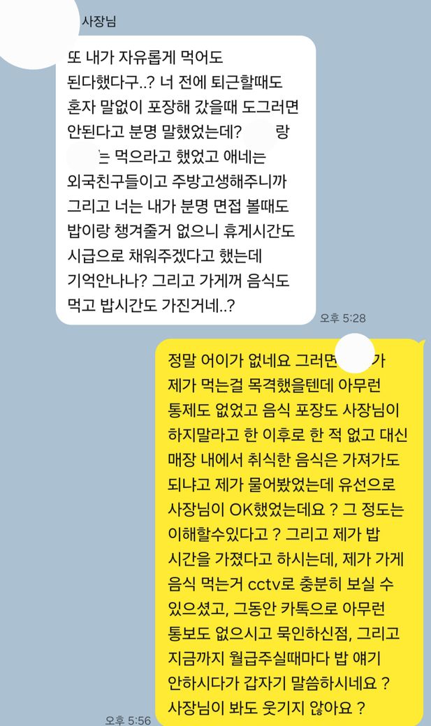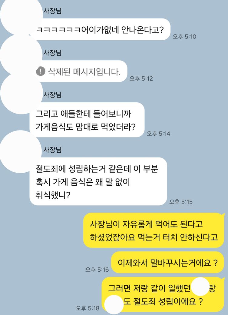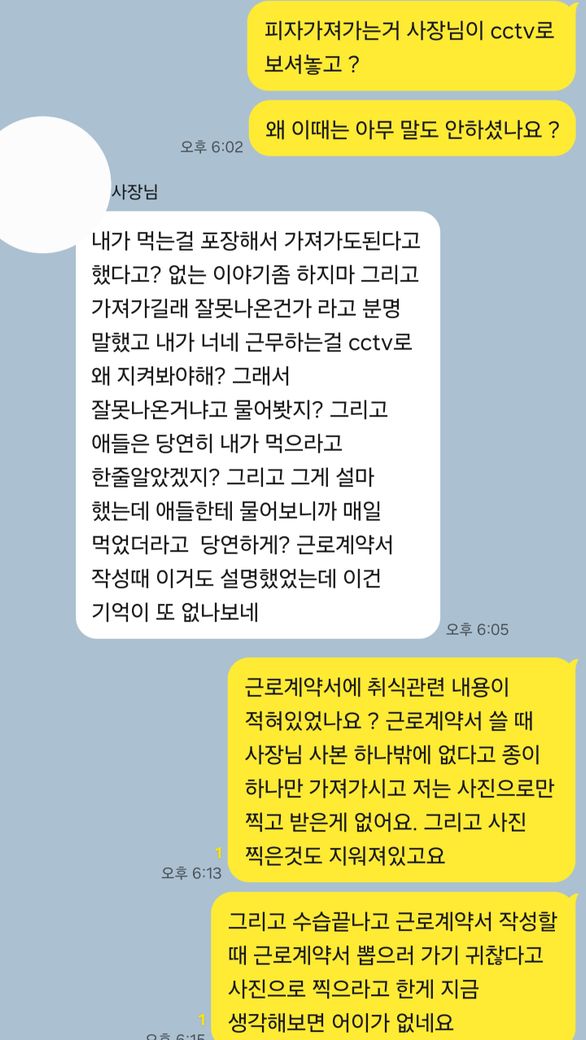사장님이랑 해당 다툼 이전에 알바 퇴사관련 언쟁이 있었고, 사장님한테 밀린 급여랑 못받은 주휴수당까지 달라고 하니까 사진처럼 절도죄 관련으로 가려고 하시네요. 사장님은 분명히 저한테 "먹는거 터치안하니까 매장내에서만 먹어라, 대신 싸가는건 안된다"라고 유선으로 말씀하셨고 (제 주장). 그 이후로 매장에서 먹다 남은거 가져간거 외에는 가져가지 않았는데, 사장님은 카톡 내용처럼 같이 일하던 알바들은 매장 취식을 해도 된다고 했지만, 저한테는 하면 안된다고 합니다. 또한 제가 알바 끝나고 피자 가져가는걸 CCTV로 보고도 당일날 아무런 행동도 취하지 않으셨구요. 이것도 제가 절도죄로 처벌을 받을 수가 있을까요 ? 그리고 근로계약서를 작성할 때 근로계약서가 한 장밖에 없다고 사장님이 사본 가져가시고 전 그 사본을 캡쳐했었지만 현재 데이터가 남아 있지 않습니다. 이 부분에 대해서 노동청에 진정서를 제출할 수 있을까요 ?