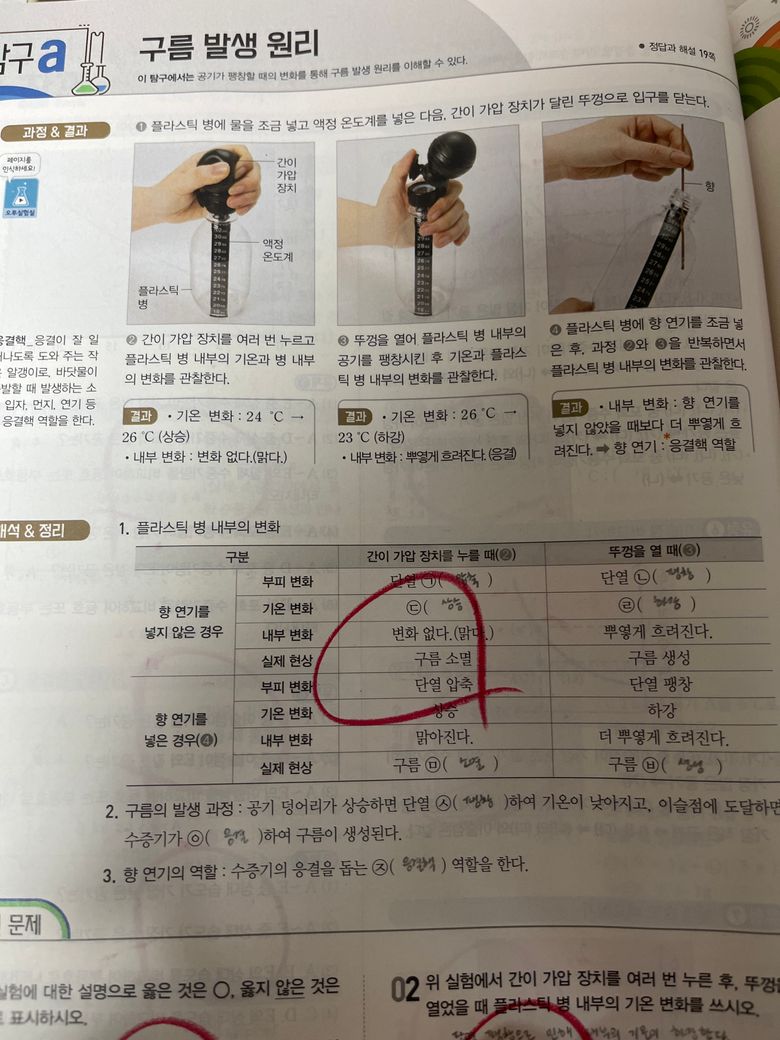 1. 여기서 간이 가압 장치는 외부의 공기를 넣는 장치인가요? 만약 공기를 넣는 장치가 맞다면, 간이 가압 장치를 이용해 공기를 넣으면 왜 단열 압축이 되는 거죠? 그저 플라스틱 내부의 기압이 높아진 것 뿐, 압축이 되는 건 아니지 않나요...?