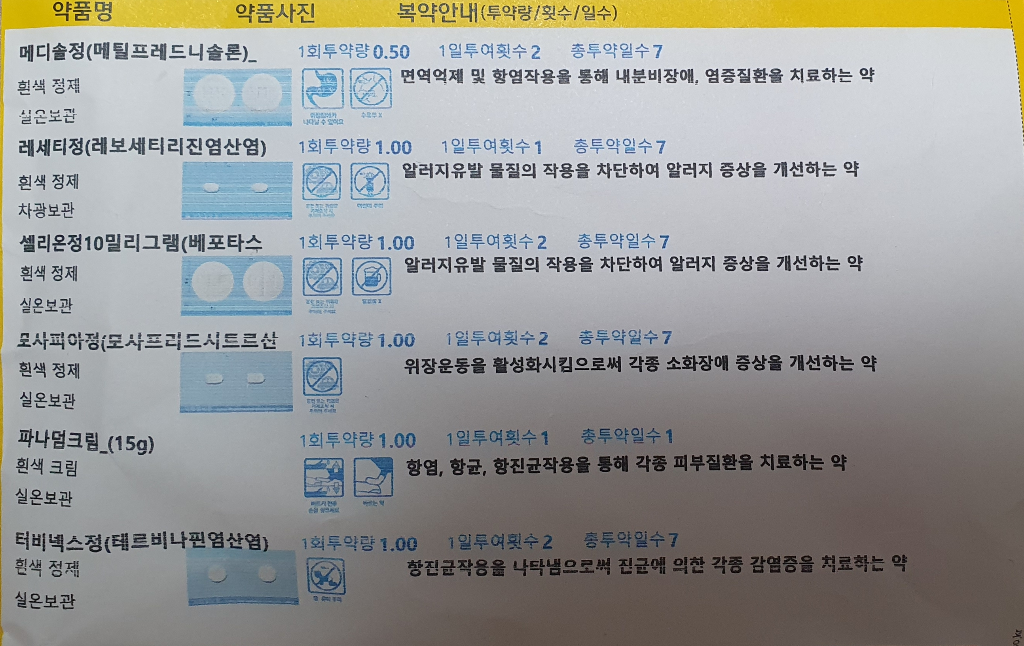 문의주신 약중에 셀리온정과 레세티정이 항히스타민제로 졸음을 유발할가능성이 있으며 셀리온 정은3세대 항히스타민제로 졸음부작용이 적으나 레세티정은 졸음이 올수 있기에 저녁이나 자기전에 따로 복용하길 권장드립니다.
