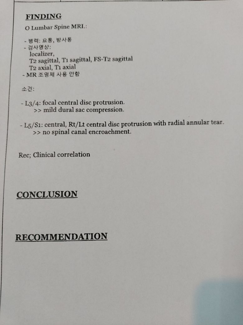 판독지상 3-4번 요추 디스크의 경미한 돌출 및 5번요추-1번 천추 사이 디스크의 경우 파열은 있지만 척수강을 침범하지 않은 상태로 통증이 유발되실 경우는 입원하시어 신경차단술 및 약물치료 등을 받으시는 것이 좋겠습니다.