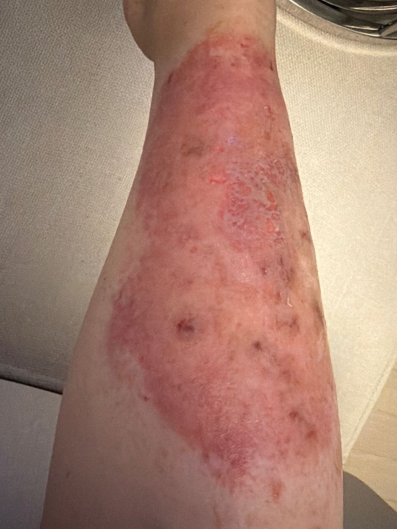 사진상 정강이 전면에 비교적 넓은 홍반과 얕은 찰과상, 주변에 갈색 색소침착이 보입니다. 중심부 상처는 약간 회백색의 얕은 섬유성 막처럼 보이는데 이는 상처 치유 과정에서 흔히 보이는 섬유소성 막 또는 재상피화 과정으로 보이며 괴사로 보일 가능성은 낮습니다. 진물이 많지 않고 통증, 열감, 부종, 발열이 없다면 전형적인 연조직염 양상과는 거리가 있습니다. 연조직염은 일반적으로 통증, 압통, 국소 열감, 빠르게 확산되는 발적, 전신 증상 중 하나 이상이 동반되는 경우가 많습니다.