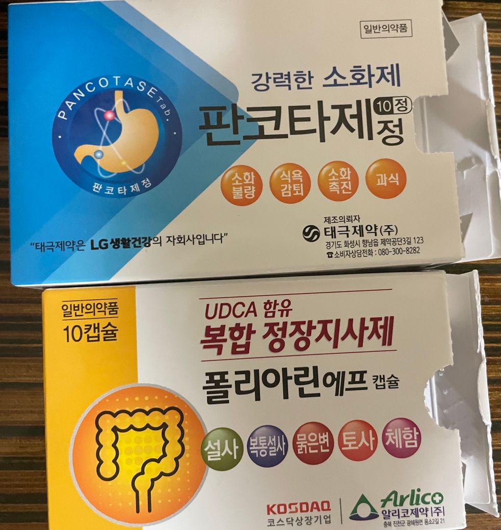 위의 알약은 한가지는 소화제 이고 한가지는 지사제 이고 물약은 소화제 입니다.