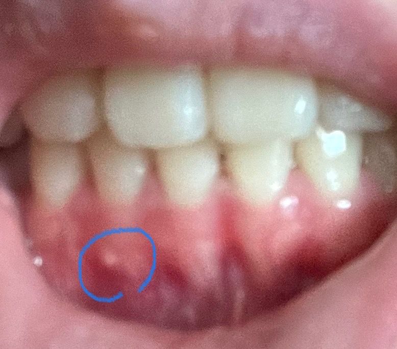 사진이 흐려서 정확히 보이진 않으나 잇몸에 뾰루지 형태로 나는 것은 구내염일 수도 있고, 잇몸 내 농양이 잡힌 것일 수도 있습니다.