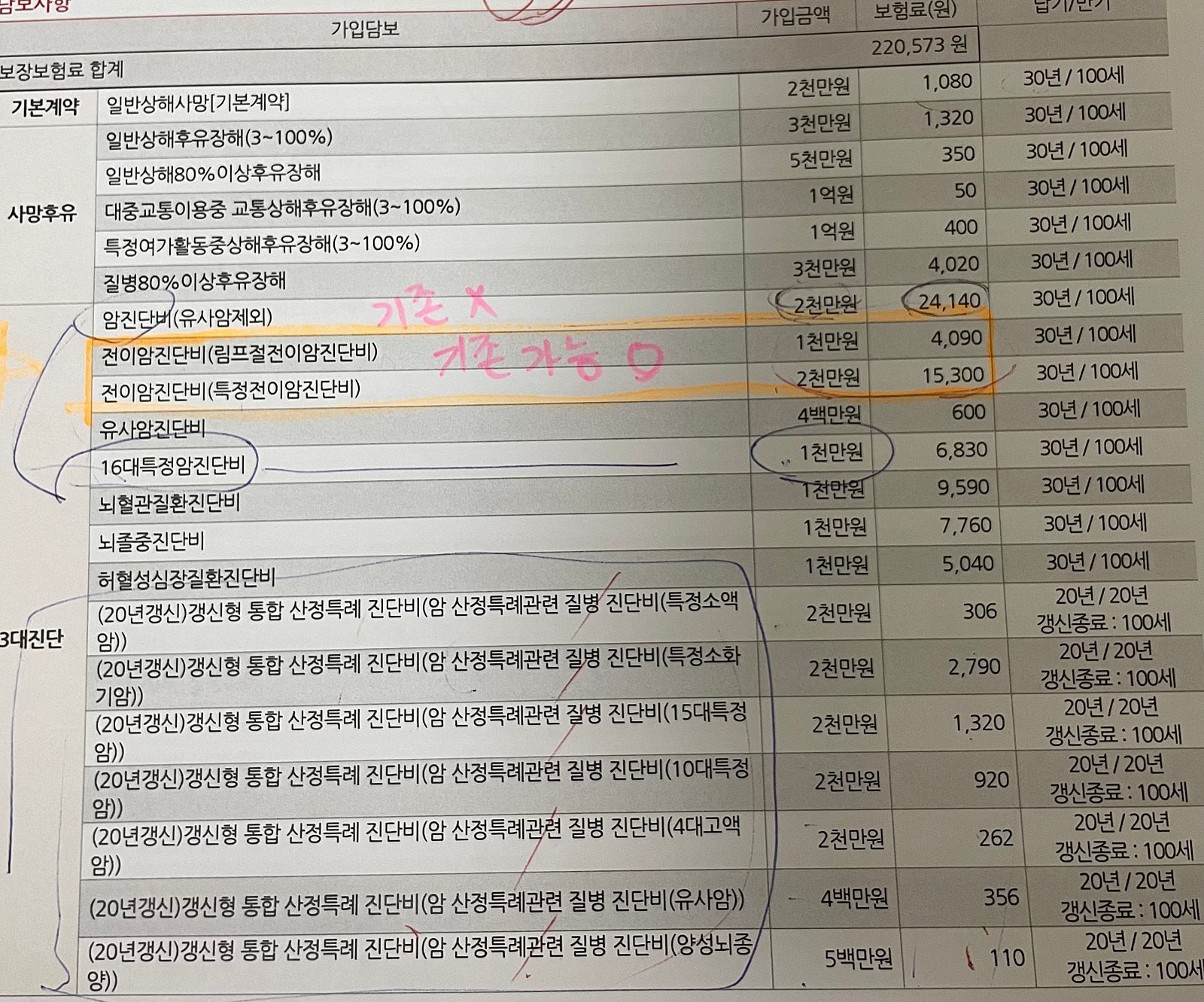 암진단비 1억 뇌혈관 3천. 심장질환 3천