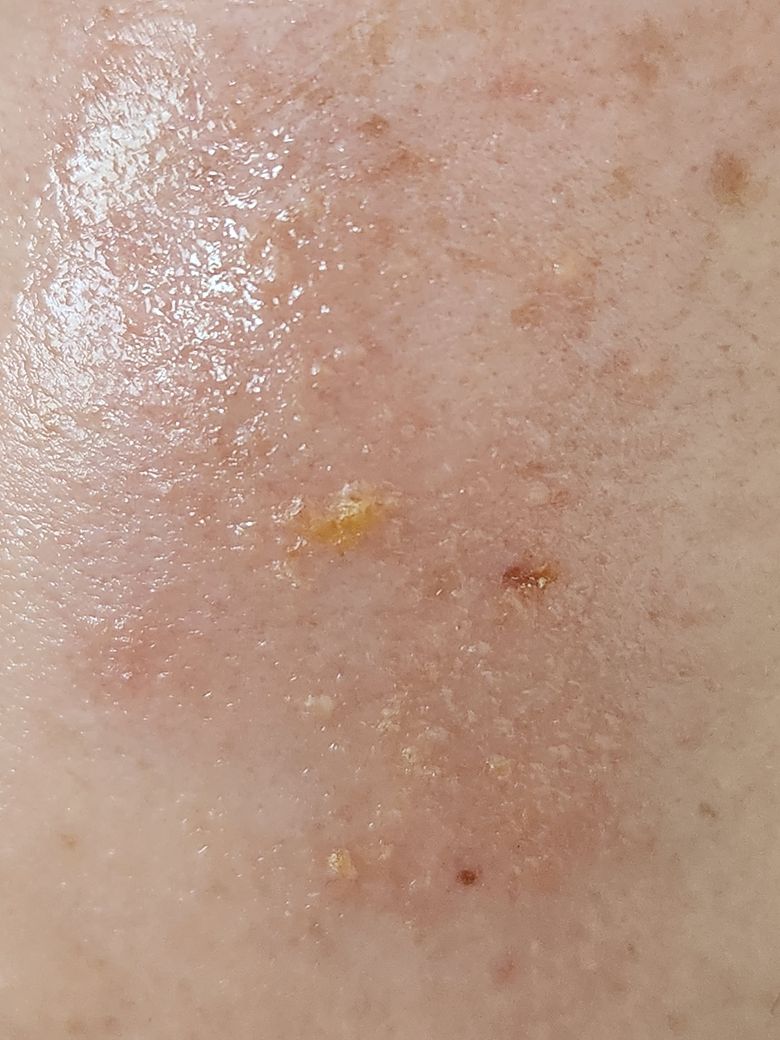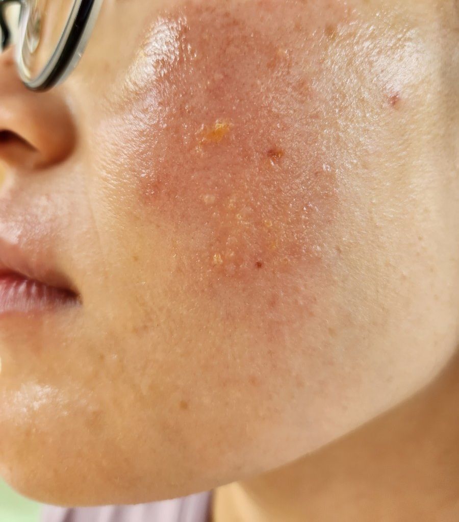 얼굴 왼쪽 볼이 3일전부터 전체적으로 빨개지고 뾰루지가 생기더니 현재 노래지면서 농이 찬 것처럼 보입니다.