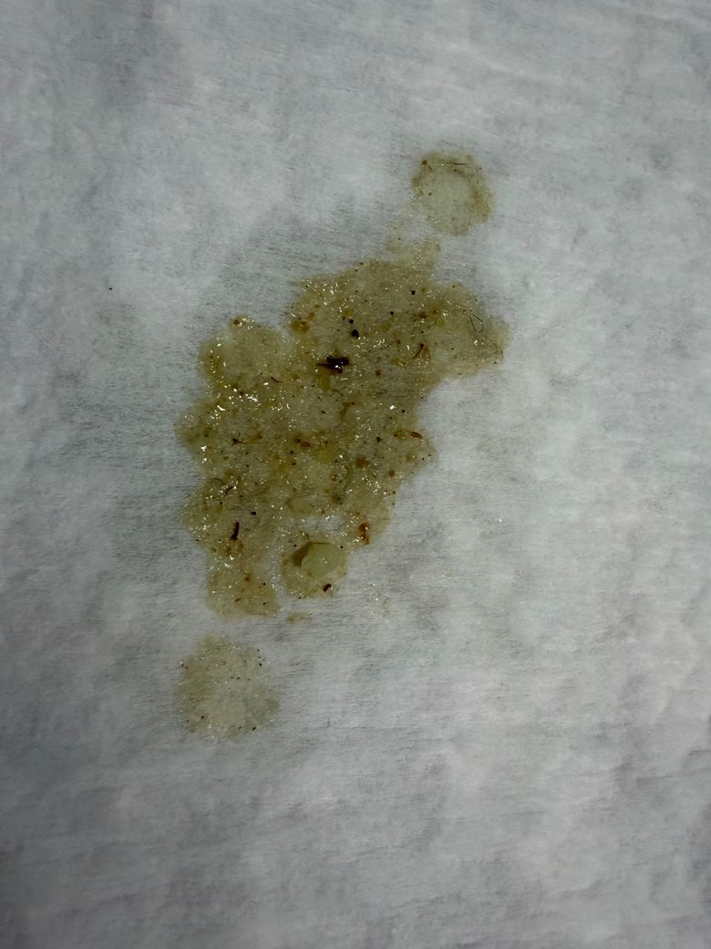 2번째 토는 색은 똥색인데 엄청 묽었어요 이때도 흰색 이물질이 보였어요