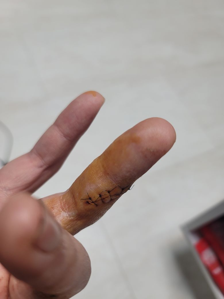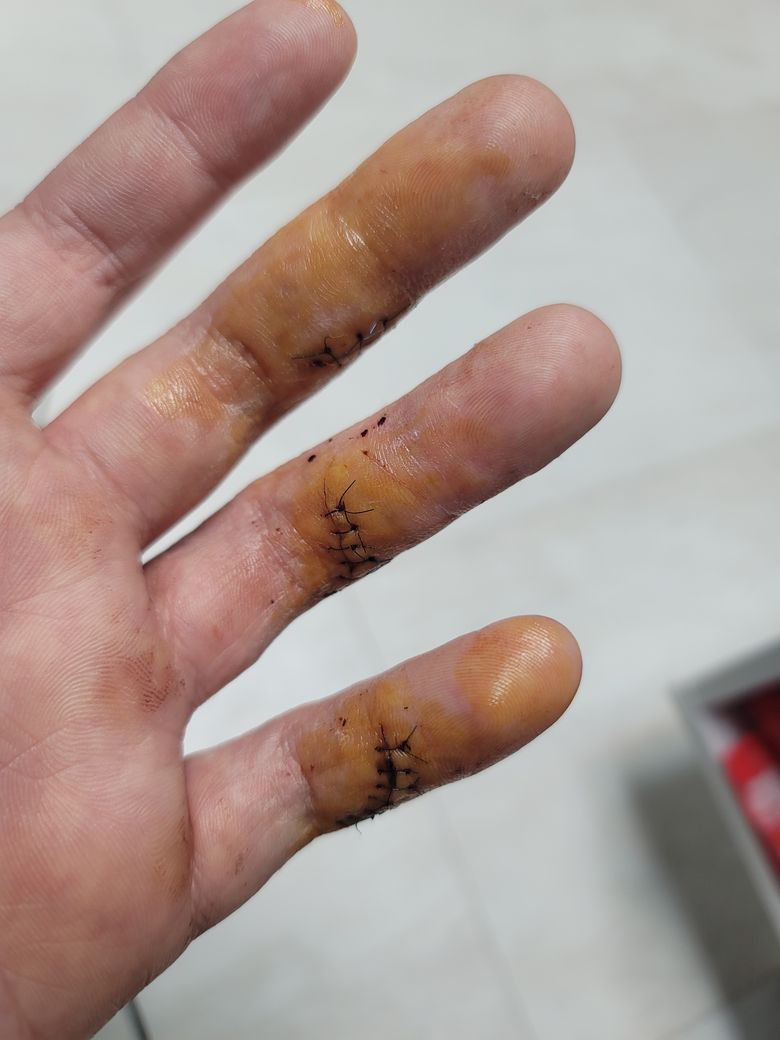 10일전 새벽에 좌측 3,4,5번째 손가락에 자상입어 다음날 오전 응급실에서 5 / 5 / 7바늘 꿰맸습니다. 정형외과 의사선생님이 상처가 깊지는 않으나 좌우로 좀 넓게 찢어졌다고 하셨습니다.