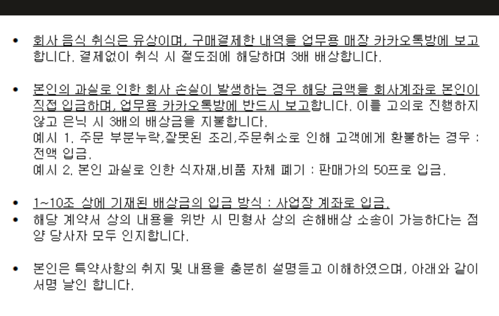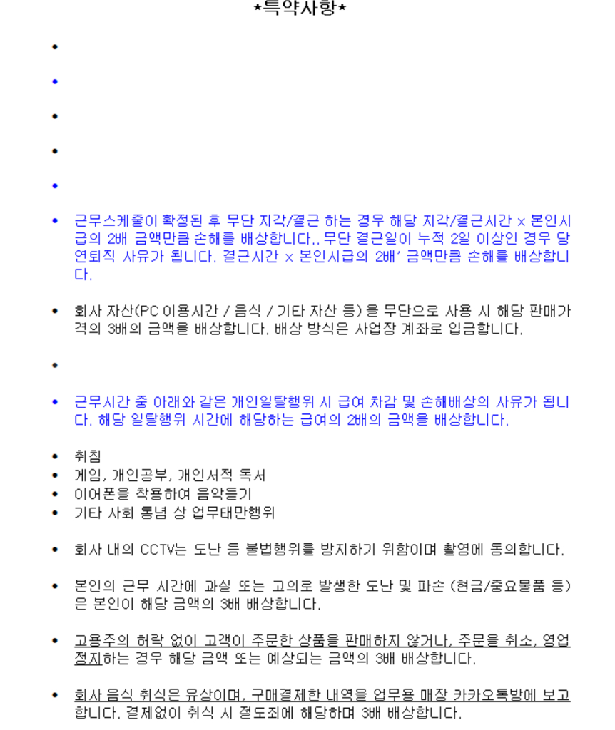 이에 따라 근로자가 근로계약 내용을 이행하지 않는 경우 일정한 금액을 배상토록 하는 것 자체가 금지됩니다.