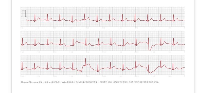 올리신 사진속의 심전도 소견은 군데군데 흔들린 소견이 있긴 하지만 지극히 정상적인 소견으로 심전도로 보았을 때에는 이상 소견이 보이지 않습니다. 다만 애플워치 같은 스마트 기기의 심전도 소견은 의료적 판단에 사용하면 안 됩니다.