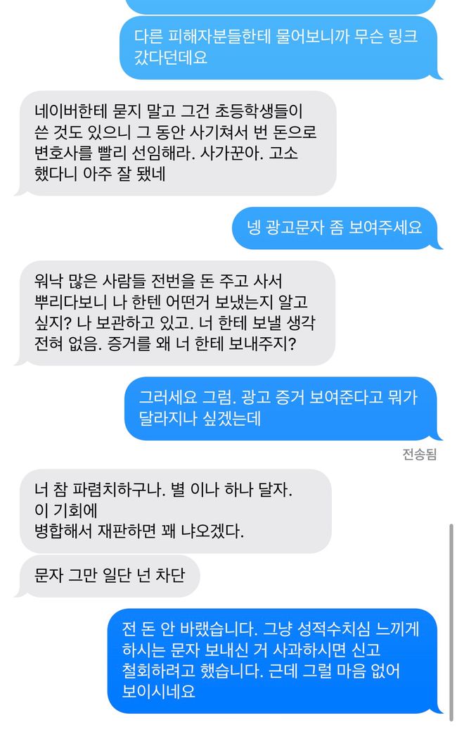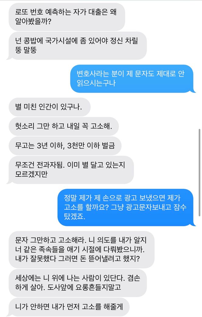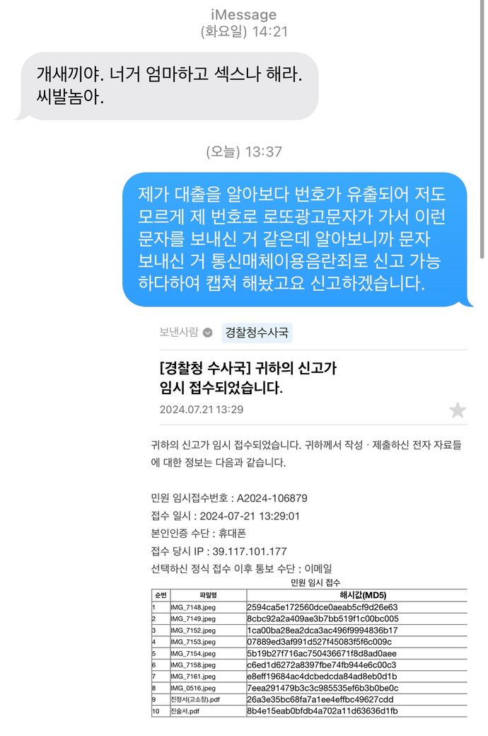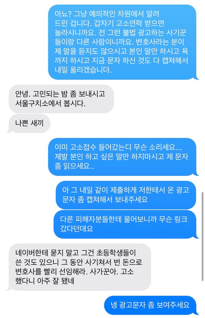 제가 대출을 알아보다 사기꾼이 제 번호를 이용해 모르는 사람들에게 불법광고 문자를 보냈고 그 문자에 화가 난 사람들이 저에게 욕설문자를 보냈습니다. 그걸 캡쳐해 통매음으로 임시접수를 넣은 상태고 상황설명했고 통매음으로 고소한다 문자를 보냈더니 이런 식으로 문자를 했습니다. 통매음으로 고소하기에는 문자가 애매하다는 거 알고 있는데 그럼 이런 식으로 계속 욕하고 기분나쁘게 문자한 거는 고소가 가능한가요?