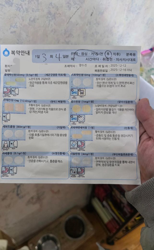 사진 처방은 항생제(클래리스로마이신), 소염진통제(아세클로페낙), 스테로이드(메틸프레드니솔론)와 기침약, 알레르기약이 함께라서, 점심약 복용 후 6시간이 지났더라도 음주는 권장되지 않습니다. 특히 소염진통제와 스테로이드는 술과 겹치면 속쓰림과 위출혈 위험이 올라가고, 알레르기약과 기침약은 졸림과 어지럼이 더해질 수 있습니다. 부득이하다면 최소량으로 1회만, 공복은 피하고 물을 충분히 드시며 그날은 약 복용 시간에 맞춰 추가 음주는 중단하시는 쪽이 안전합니다. 흑변, 토혈, 심한 복통이나 어지럼이 나타나면 즉시 복용과 음주를 멈추고 확인이 필요합니다. 감사합니다.