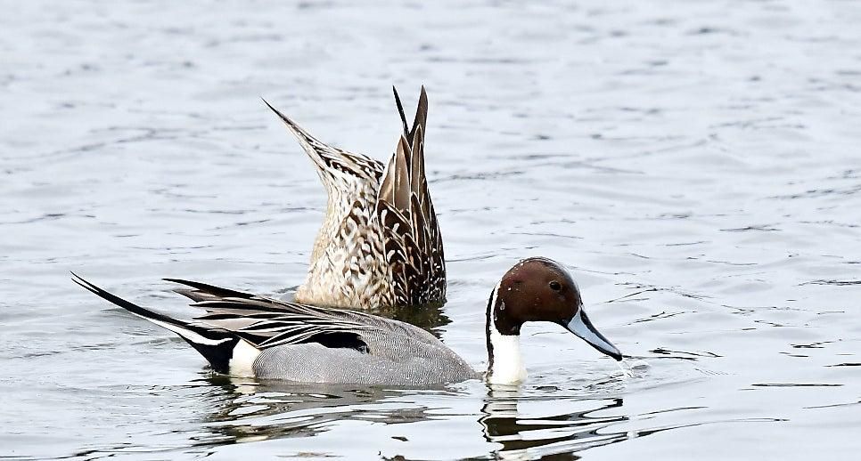 청둥오리와 같은 대부분의 오리는 수면성 오리에 속하는데요, 이들은 물 위에 떠 있으면서 먹이를 찾거나 몸을 거꾸로 세워 상체만 물속에 넣는 방식으로 먹이를 찾습니다. 반면 말씀해주신 고방오리는 잠수성 오리에 가까운 생태적 특징을 가지고 있기 때문에 물속으로 완전히 잠수하여 먹이를 찾는 능력이 더 발달해 있습니다.