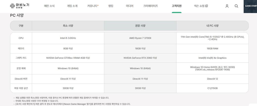 이게 아래 최소~권장 사양과 비교했을 때 게임이 어느 정도 돌아갈만한 사양이 되는지 한번 봐주세요.