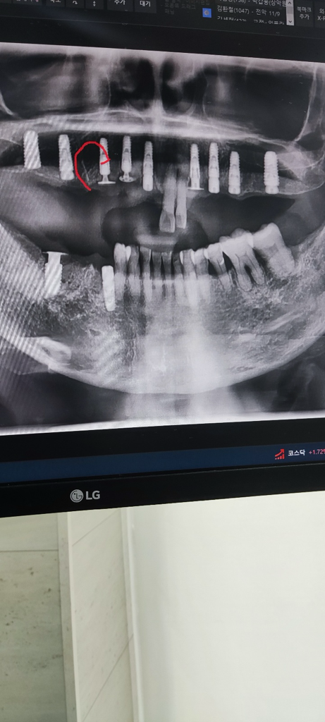 임플란트 자체의 문제보다는 임플란트를 감싸고 있는 뼈 부분에서 날카로운 부분이 있는 것으로 보여집니다. 2차 수술을 할때 해당 부분을 다듬어주면 큰 문제는 없어 보이나 정확한 판단을 위해서는 x-ray 사진이나 ct 등을 통해 평가가 필요해보입니다.