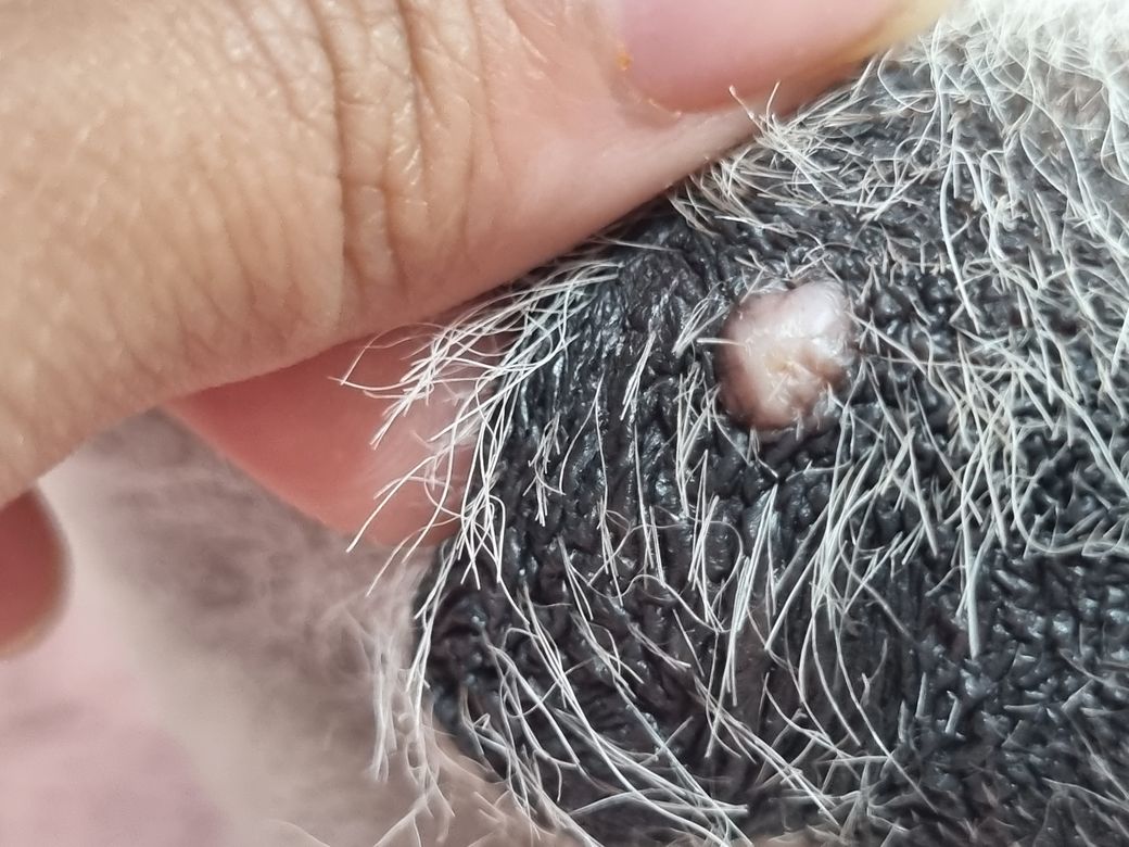작년에 미용하고 강아지 고환 표면에 분홍색 덩어리가 있는 것을 확인했습니다.