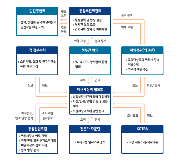 양자협의, WTO, FTA협상 및 이행위원회 등 다각적인 통상채널을 활용하여 비관세장벽 관련 문제를 제기하고, 제도 및 관행 개선을 위한 협의 진행