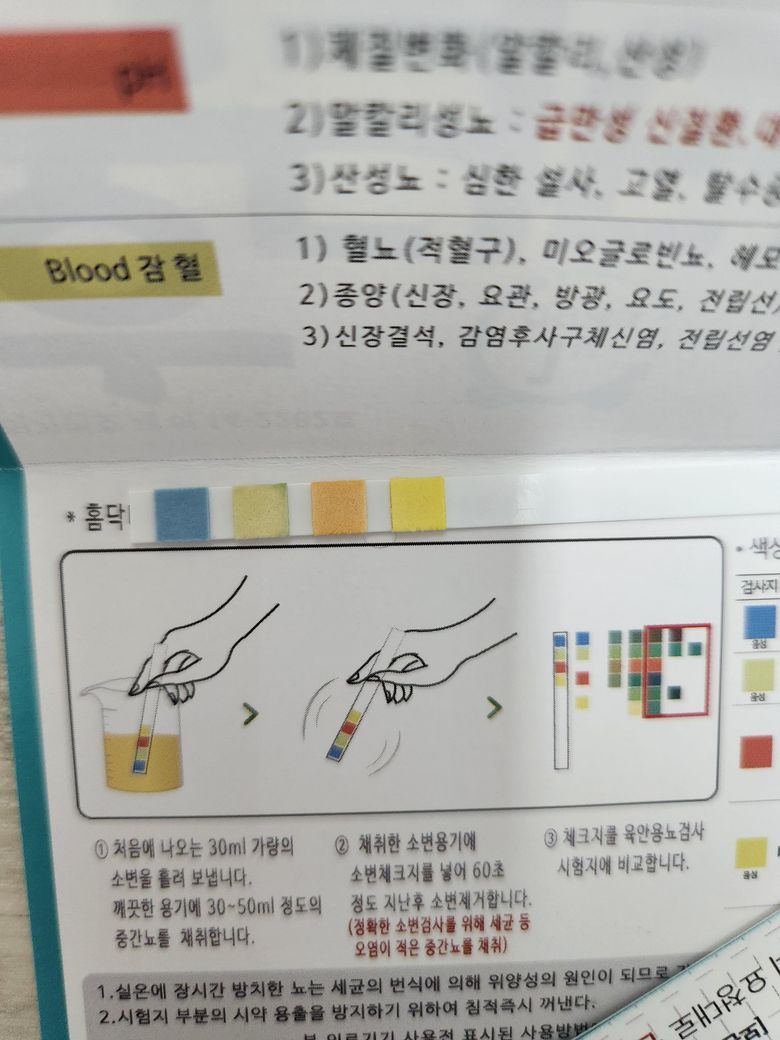 방법은 종이컵에 중간소변부터 받았고 스틱을 1초정도 빠르게 푹 적시고 뺀후 스틱에 뭍은 소변은 살짝 털어줬습니다 그런데 단백뇨 칸만 번번히 테두리가 진하게 변하는 느낌이에요 ..테두리가 변하면 단백뇨 있다는 쪽에 가깝나요?