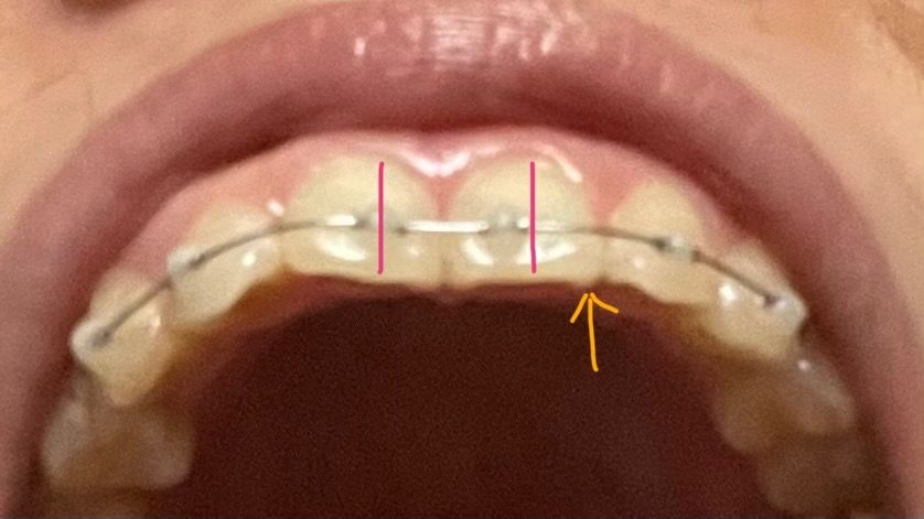 4. 사진처럼 세로로 실금이 있고 교정하면서 화살표(뒷면 통통한부분) 부분이 아랫니랑 맞닿기시작했는데 실금에 영향은 없을까요?