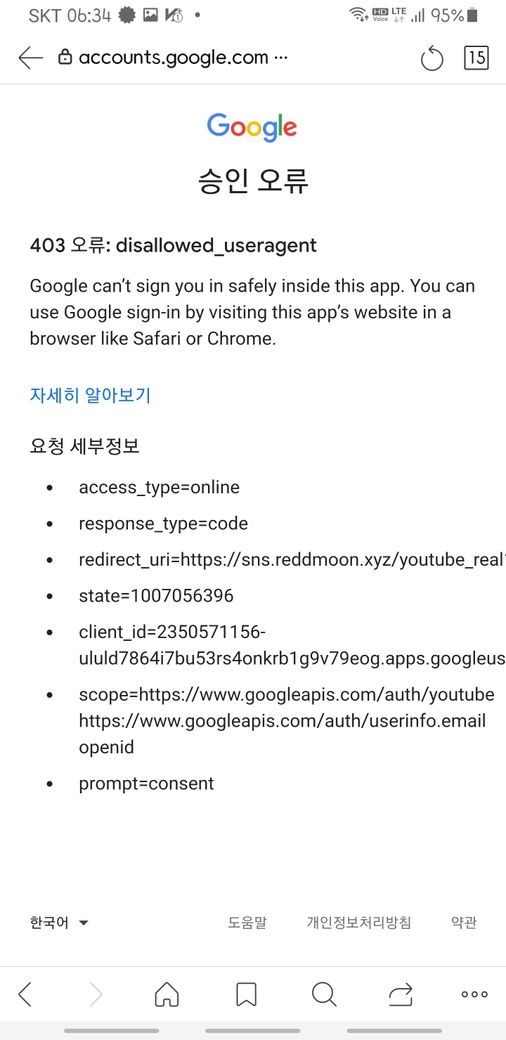 Googlx에서 보안강화를 위해 특정 웹브라우저만 이용할 수 있게 변경되면서 생기는 오류라고 해요.