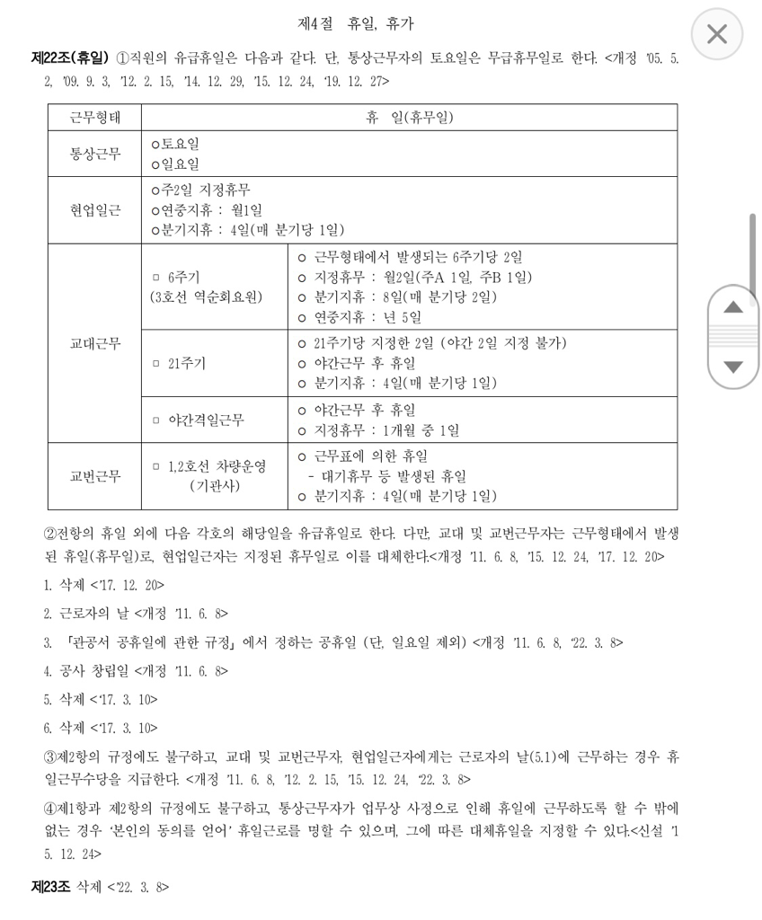 따라서 교대 근무에 따라 주중 부여되는 기존의 휴일(휴무일)과 대체하는 것은 바람직하지 않을 것으로 판단됩니다.