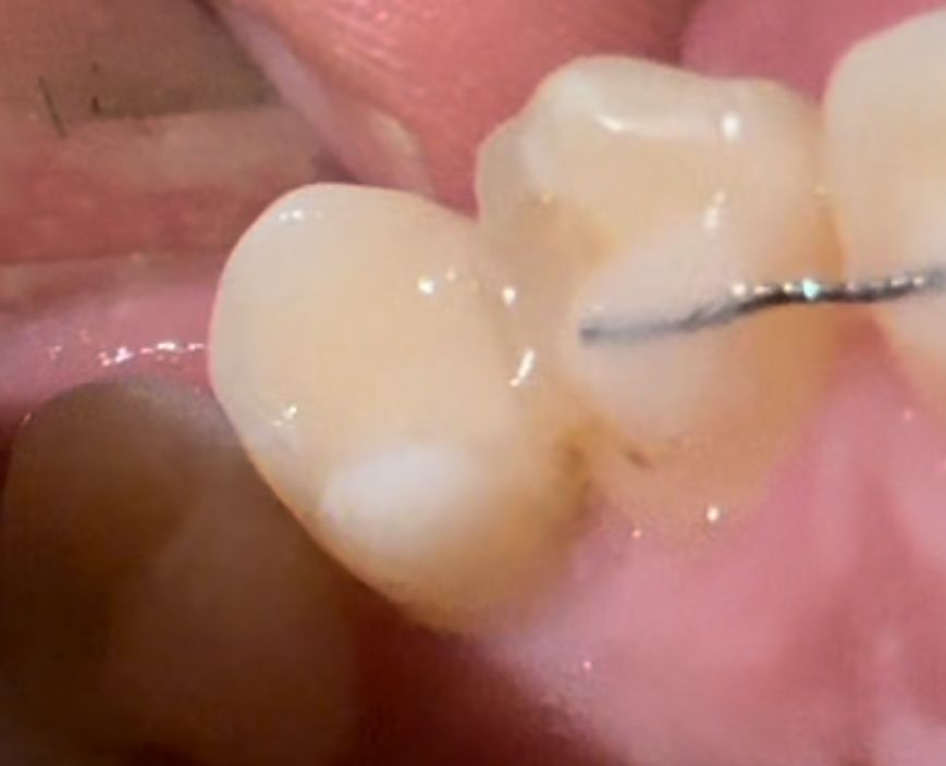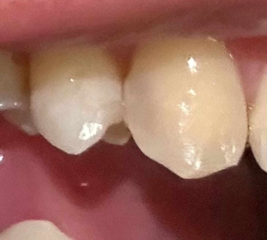 혹시 레진 안에 충치가 생긴건가요? 사진은 다 하나의 송곳니 입니다 핸드폰 라이트를 비추면 검은색이 잘 안보이고 라이트를 끄면 잘보이는 거 같아요