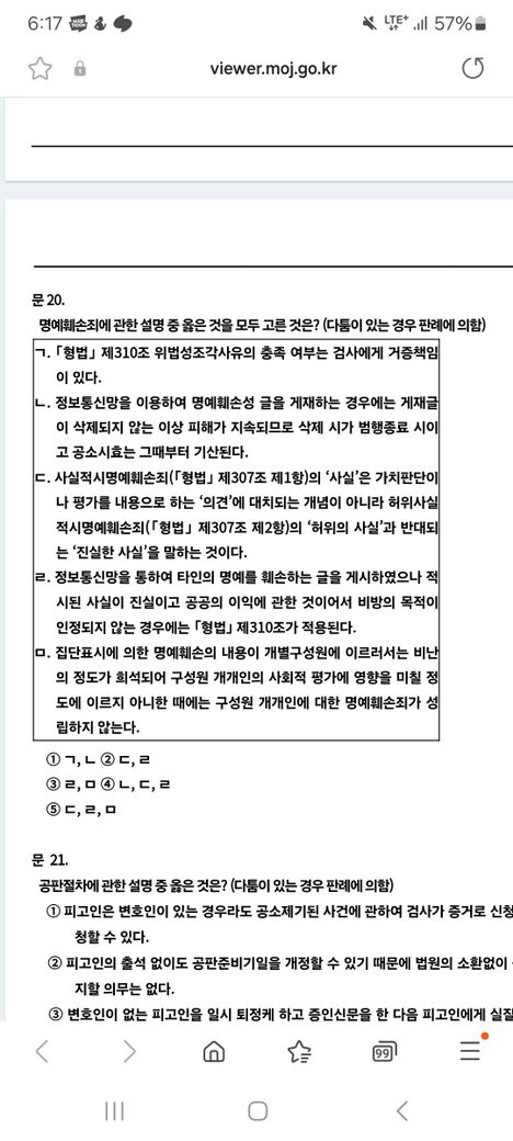 첨부한 사진의 ㄹ부분을 보면. 대판 2020.3.22, 2018도15868 판례에서 정통망법의 구성요건해당성 중 초과주관적구성요건 부분을 부정한 것으로 이해해야 함에도, ㄹ선지는 형법 제 310조의 위법성조각을 주장했기에 틀린 선지여야 함에도, 맞는 선지로 나왔습니다.